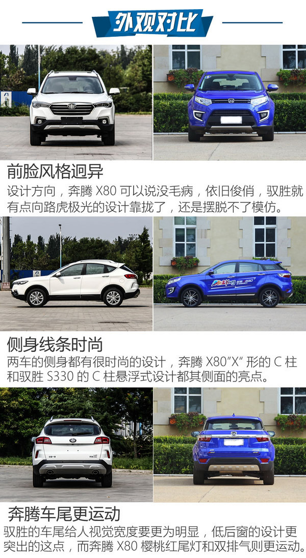 設計方向,奔騰X80可以說沒毛病,依舊俊俏,馭勝就有點向路虎極光的設計靠攏了,還是擺脫不了模仿。兩車的側身都有很時尚的設計,奔騰X80”X“形的C柱和馭勝S330的C柱懸浮式設計都其側面的亮點。馭勝的車尾給人視覺寬度要更為明顯,低后窗的設計更突出的這點,而奔騰X80櫻桃紅尾燈和雙排氣則更運動。