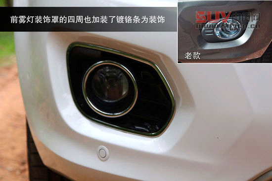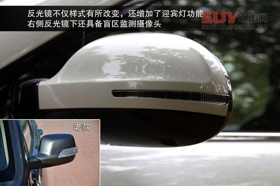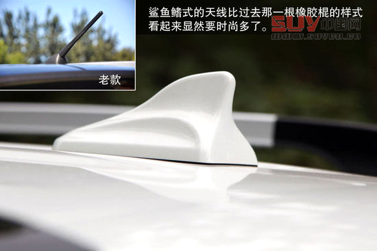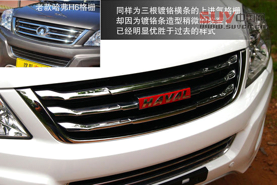 2013款哈弗H6使用了全新的哈弗品牌標志,相比老款中網的變化非常明顯,除了紅色的品牌標志外,進氣口的鍍鉻裝飾條要更加洋氣,同時霧燈裝飾罩也增加了鍍鉻飾條。此外新款哈弗H6頂部的行李架采用了鋁合金材質且前后兩端采用了黑色烤漆的裝飾;車門下方亮銀色的防擦條隨著車身上的棱線也比老款的更富有立體感;鯊魚鰭式的天線比過去那一根橡膠棍看起來顯然要時尚多了。