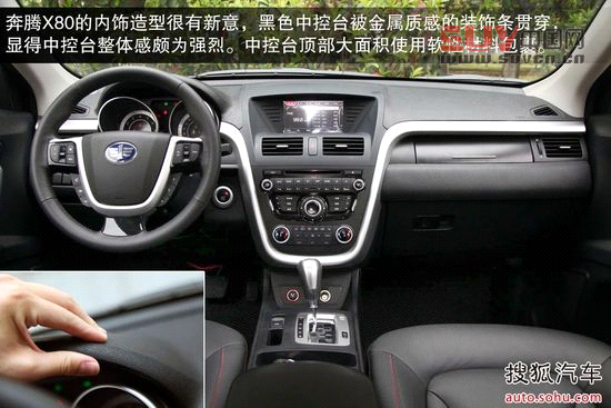 奔騰X80的內飾造型很有新意,黑色中控臺被金屬質感的裝飾條貫穿,顯得中控臺整體感頗為強烈。中控臺頂部大面積使用軟性材料包裹,雖然手感不是很軟,但是在觸感和做工方面已經值得肯定。X80車內的異味非常小,甚至以及超越了部分合資車的車內空氣質量。