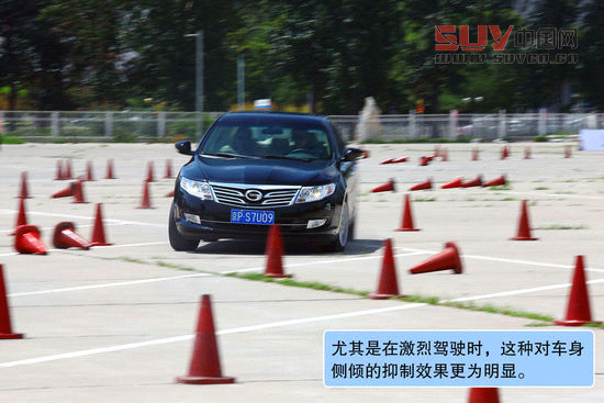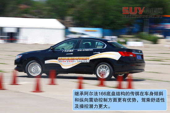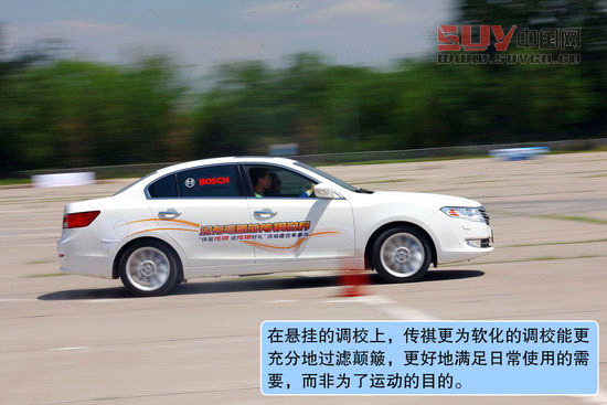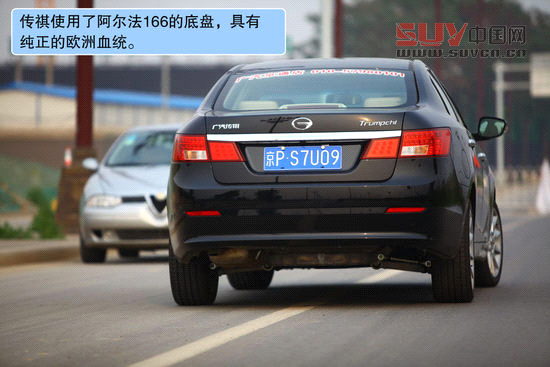 傳祺GA5使用阿爾法羅密歐166的平臺開發,并非來自廣汽豐田和廣汽本田的技術,因此屬于歐洲血統。懸掛行程偏短,因此獲得極佳的運動感,路面反饋直接,經過減速帶時干凈且輕微的跳動都帶有明顯的歐洲車的特性。高速表現讓人充滿信心,表現穩健,車速超過120公里時,能夠影響駕駛樂趣的只是車身后部略大的輪噪。偏向于運動型車的調校用來形容傳祺十分貼切,方向盤的轉角很小,為保持穩定性力道就稍稍偏重一些,沒有配備隨速助力在低速時會有些不便。傳祺方向盤對于偏小的轉角來說就顯得有些大,開慣了日系車的朋友需要一段時間來適應。