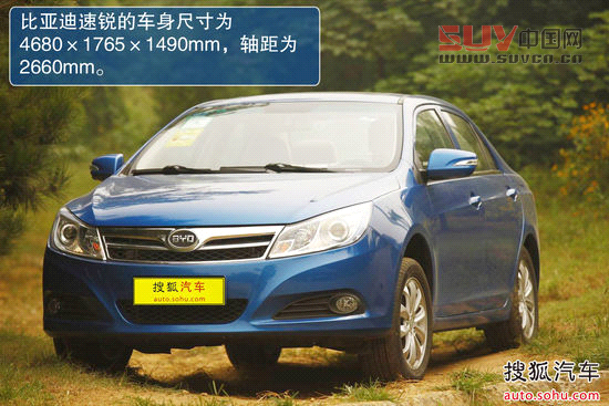 在外觀方面,速銳改變了比亞迪的山寨設計陰影,速銳在設計上有了自己的風格。速銳魚眼式透鏡自動前大燈與鍍鉻進氣格柵使速銳看起來更為精神,兩條弧線分別從翼子板兩側下滑聚集在格柵下方,行成一個大嘴的造型,可以看出比亞迪在速銳這款產品上下了不少功夫。