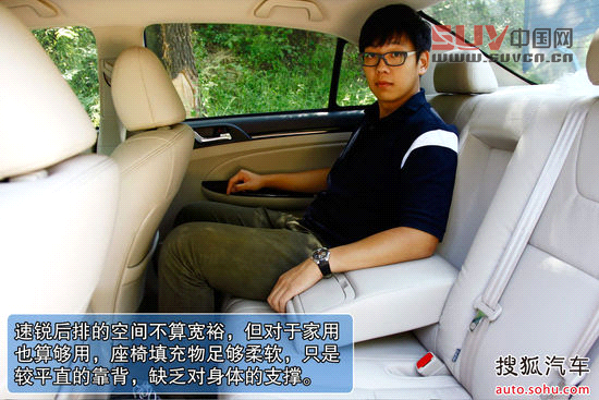 空間方面,速銳的長寬高分別為4680/1765/1490mm,軸距為2660mm,在同級車型中屬于中等水平,實際體驗,身高178cm的體驗者,坐在前排頭部空間為3指左右,坐在后可以擁有一拳以上的腿部空間,只不過后排頭頂空間則相對局促,對于一般的家庭來說空間表現倒基本夠用,只是不能奢求什么而已。