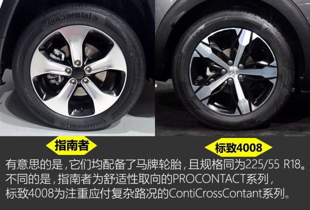 本次兩款展出的車型配備的輪胎所采用的品牌和規(guī)格都是一樣的,18英寸的輪圈在這個級別里已經(jīng)足夠有視覺沖擊力了。另外,它們的輪圈樣式相似度也很高,均為五輻式,標(biāo)致4008稍微更顯花哨。