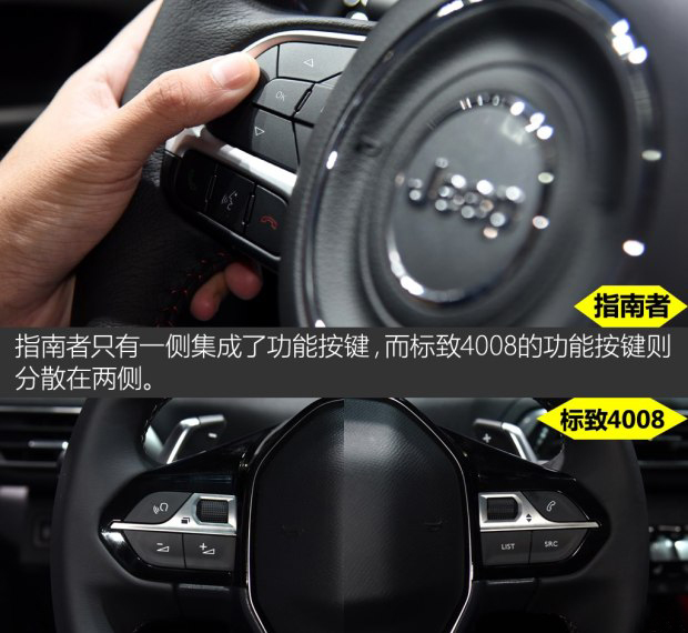 指南者的圓形方向盤相信大家都非常熟悉了,雖然采用皮質(zhì)包裹,可握感偏硬,上面集成了藍(lán)牙電話以及行車電腦菜單控制按鍵。標(biāo)致4008的方向盤感覺像是游戲手柄,十分酷,握感更出色,上面集成了功能按鍵與指南者一樣,只不過分散在兩側(cè)。至于儀表盤,盡管標(biāo)致4008展現(xiàn)了與眾不同的科技感,可如此前衛(wèi)未必能被大多數(shù)人接受,而相比之下,指南者的風(fēng)格就穩(wěn)妥許多了。