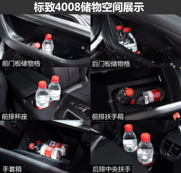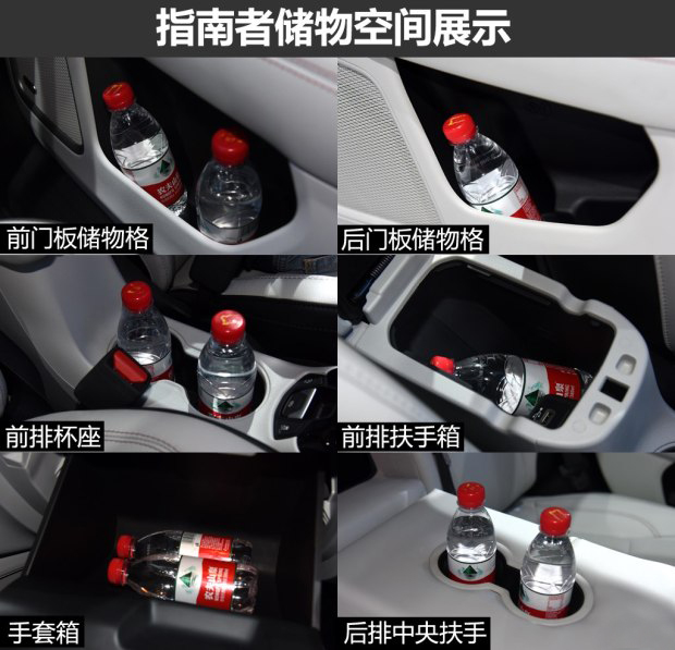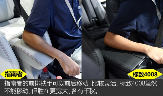 兩款車型的儲物格數(shù)量都差不多,只是細(xì)節(jié)設(shè)計方面有差異,指南者的前門板儲物格相對較小,并且只設(shè)置了一個杯座,而標(biāo)致4008則可以同時放兩瓶水。另外,指南者的前排扶手箱同樣遜色于標(biāo)致4008。綜合來看,標(biāo)致4008在細(xì)節(jié)處理方面更到位。