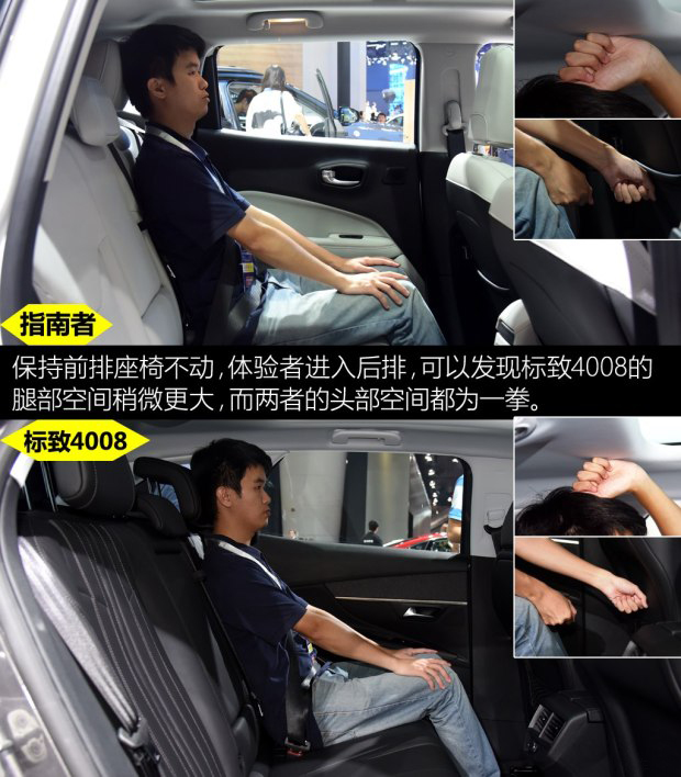 剛才在進(jìn)行車身尺寸對比時,我們知道標(biāo)致4008的軸距數(shù)據(jù)較指南者多了94mm。那么,它們的乘坐空間實際表現(xiàn)又如何呢?我們馬上來揭曉。