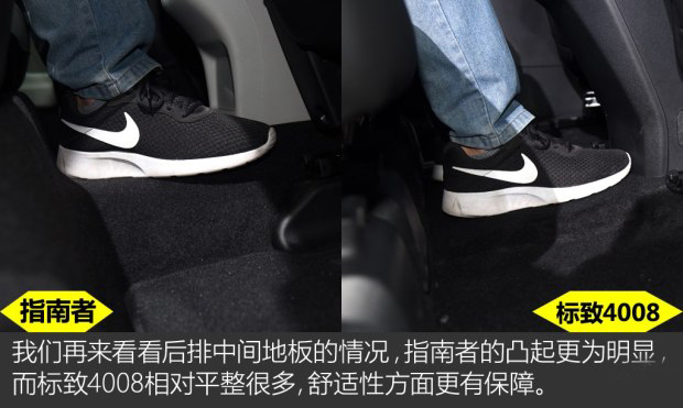 通過實際體驗,可以看到兩款車型無論前排頭部空間還是后排腿部/頭部空間都有不俗表現(xiàn),其中它們的腿部空間都有兩拳多余量。當(dāng)然,標(biāo)致4008稍微更大一些。另外,標(biāo)致4008在細(xì)節(jié)方面做得更好,它的后排地板相對平整,若有乘客坐在中間,舒適性能有效保證。