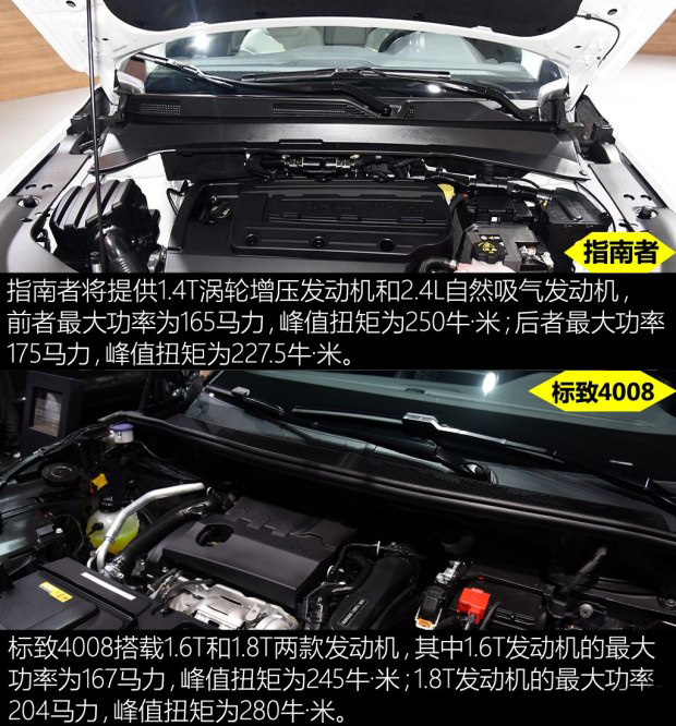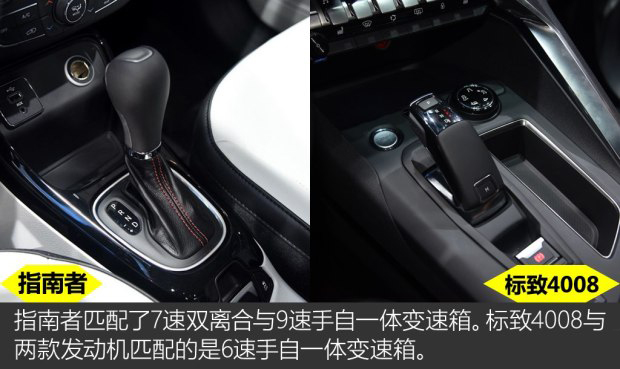 無論是指南者還是標(biāo)致4008,它們都提供了兩款發(fā)動機給大家選擇。其中指南者為1.4T和2.4L,標(biāo)致4008則為1.6T和1.8T。傳動系統(tǒng)方面,指南者匹配了7速雙離合與9速手自一體變速箱,而標(biāo)致4008統(tǒng)一匹配6速手自一體變速箱。