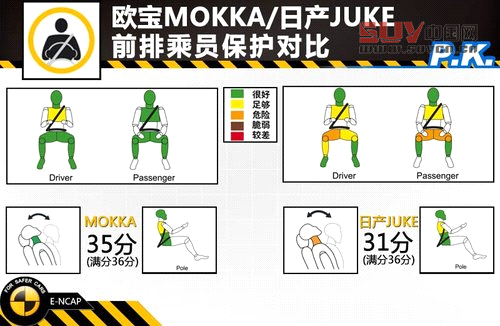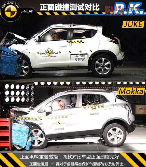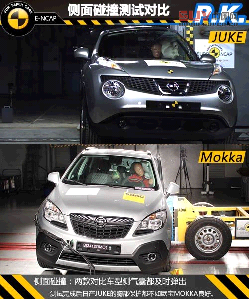 值得肯定的是日產JUKE在側面碰撞時氣囊都能夠及時的彈出,并且車門能夠成功的進行緩沖撞擊,在這里歐寶MOKKA并沒有發生車頂的變形,在最終成績則要好于日產JUKE。