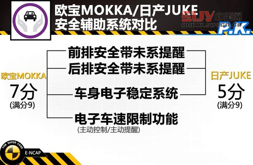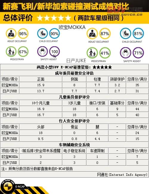 在此次碰撞測試中兩款車均為5星的成績,在行人安全保護上歐寶MOKKA大幅領先同級車型JUKE。同時對于兒童安全的保護以及車輛輔助安全系統歐寶MOKKA都有著相當不錯的表現。