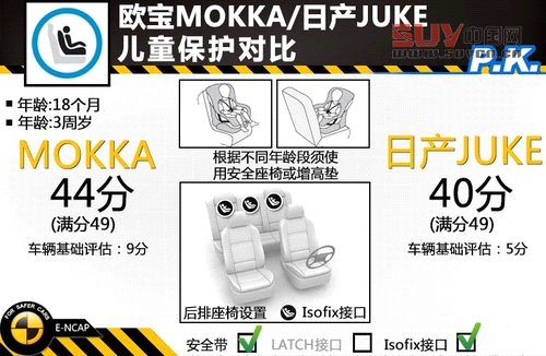 兒童安全保護也是評定一款車型的安全標準之一,并且有針對性的對18個月和3歲兒童進行模擬測試。在車內兒童安全接口提示和安裝方式上,兩款車在車內的后排座椅提供了三個ISOFIX接口,操作上也較為簡單,在安裝指示方面,標識明確,為此在兒童保護安全的評分中歐寶MOKKA為44分,日產JUKE為40分,分差則主要體現在車輛的基礎性配置上。