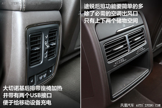 途銳提供消費者前排座椅通風+加熱的功能,而且兩者是可以一起作用的,能夠用干燥而溫暖的氣流保證乘客后背、腿部清爽;這兩項功能在大切諾基上只能分別開啟,但它還提供后排座椅加熱功能,另外后排還提供兩個USB接口,方便給移動設備充電。