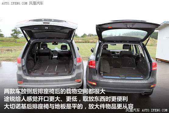 兩款車都有很寬大的車身,所以在車內乘用空間上都表現出色,在相同模特的演示中也坑看出這種結果。更具體的感覺是,途銳車內給人的空間感更大,相應地大切諾基給人更緊的環抱感,某些時候會覺得空間相對要小一些。但實際的測量數據卻顯示大切諾基的車內乘用空間要比途銳略大一些,比如前后排高度和橫向寬度。