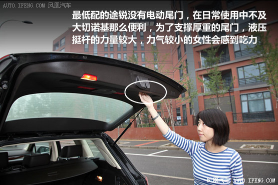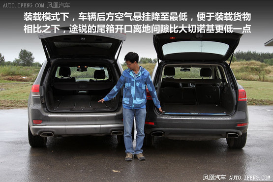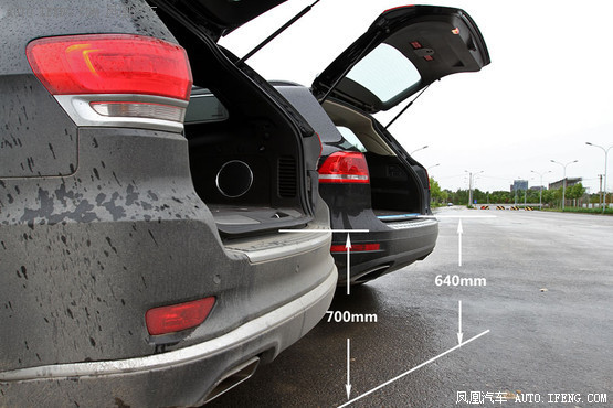 大切諾基在換擋桿后方的空氣懸掛調節處控制,相比之下途銳能夠在車后直接控制,在實際使用時顯得更方便一些,而且在后懸掛降低之后,后備箱開口離地面的高度也是途銳更低一些。但是,大切諾基配置更高,擁有電動尾門,可以用鑰匙遙控或由車內、車尾的按鍵進行控制,而中低配途銳是無此功能的,一些力氣不大女性用戶可能會感到吃力。