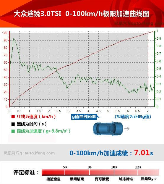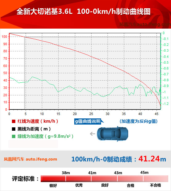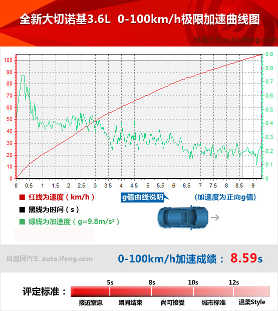 由于8速變速箱齒比的原因,加速至100km/h需要升至3檔,考慮到車重、動力的綜合影響,在每一檔是途銳的加速度都要略高于大切諾基,而且它的2檔能達到的速度更高,3檔所需時間更短。最終途銳7秒出頭的成績完成加速,而大切諾基則要慢了1.5秒。