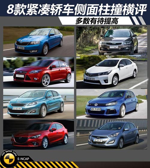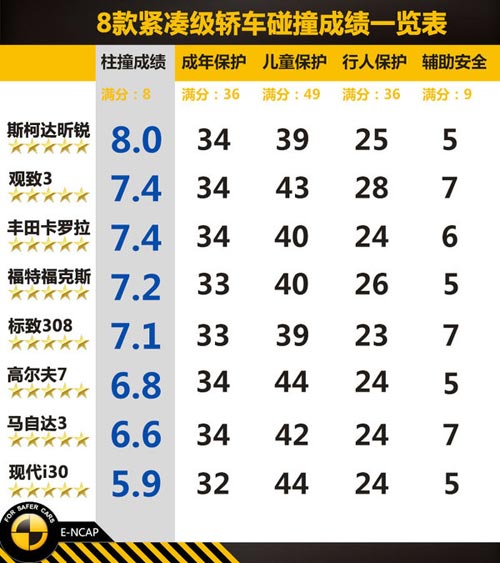 這次我們選擇的車型分別為:斯柯達昕銳、豐田卡羅拉、觀致3、福特福克斯、標致308、高爾夫7、馬自達3以及現代i30。從E-NCAP公布的柱撞成績我們可以看出8款車中只有昕銳取得了8分滿分的優異成績。觀致3和卡羅拉并列第二,成績均為7.4分。而現代i30的得分最低,僅為5.9分。其余4款測試成績從7.2分至6.6分不等。