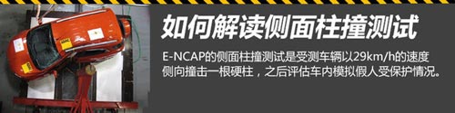 在造成致命傷害的車禍中有近四分之一來自側面的碰撞。這其中很多種情況是一輛車撞向另一輛的側面或撞上固定的類似柱狀物體,比如道路兩邊的樹或電線桿。為了驗證車輛在這種情況下對車內乘員的保護是否充分,E-NCAP加入了側面柱撞測試。測試車輛以29km/h的速度側向撞擊一根硬柱,撞擊后再評估車內模擬假人受保護的情況。