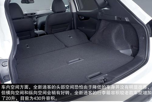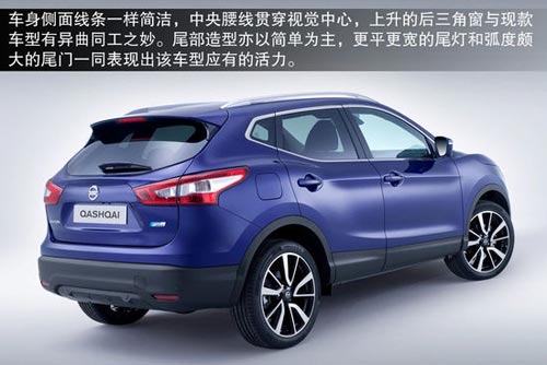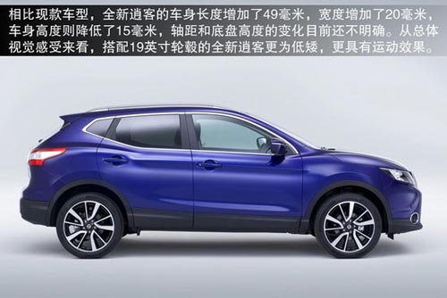 車身側面線條一樣簡潔,中央腰線貫穿視覺中心,上升的后三角窗與現款車型有異曲同工之妙。尾部造型亦以簡單為主,更平更寬的尾燈和弧度頗大的尾門一同表現出該車型應有的活力。相比現款車型,全新逍客的車身長度增加了49毫米,寬度增加了20毫米,車身高度則降低了15毫米,軸距和底盤高度的變化目前還不明確。從總體視覺感受來看,搭配19英寸輪轂的全新逍客更為低矮,更具有運動效果。