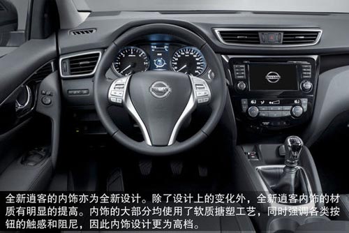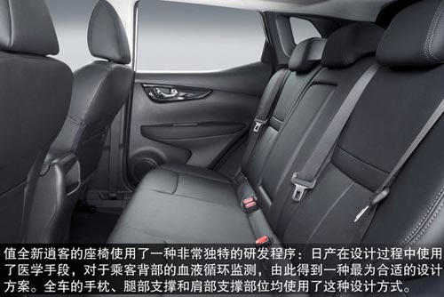全新逍客的內飾亦為全新設計,除了設計上的變化外,全新逍客內飾的材質有明顯的提高。值得一提的是,全新逍客使用的座椅使用了一種非常獨特的研發程序:日產在設計過程中使用了醫學手段,對于乘客背部的血液循環監測,由此得到一種最為合適的設計方案。全車的手枕、腿部支撐和肩部支撐部位均使用了這種設計方式,因此全新逍客的座椅非常強調人機工程學設計。