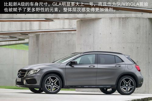 或許是由于出自同一平臺的緣故,GLA的外形與新A級有著極高的相似度,其車燈和中網的樣式幾乎照搬了奔馳A級的設計,前包圍也與A級如出一轍。這樣的設計使得GLA具有和新A級一樣的動感,營造出的運動氛圍呼之欲出;不過比起新A級的車身尺寸,GLA明顯要大上一號,而且作為SUV的GLA前臉也被賦予了更多野性的元素,整體層次感變得更加強烈。