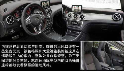 內飾方面,GLA將維持新一代A級的設計元素,同時奔馳也會提供多種款式的皮革以及飾板來供消費者搭配。如圖中所示,運動版車型的內飾意在彰顯動感與時尚,圓形的出風口還有一些復古元素;銀色格調和大量鍍鉻裝飾被應用在運動版GLA的車內,整體效果非常規整。為了更貼切地契合主題,就連運動版車型內的雙色桶形座椅都散發著極強的運動風格。