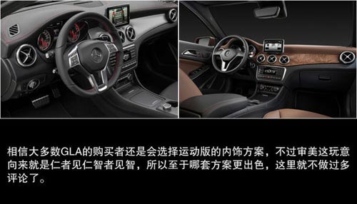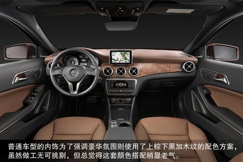 運動版車型內以黑色和銀色互相搭配為整體風格,而普通車型的內飾為了強調豪華氛圍則使用了上棕下黑加木紋的配色方案,雖然做工無可挑剔,但總覺得這套顏色搭配稍顯老氣,與GLA的整體風格不符。相信大多數GLA的購買者還是會選擇運動版的內飾方案,不過審美這玩意向來就是仁者見仁智者見智,所以至于哪套方案更出色,這里就不做過多評論了。