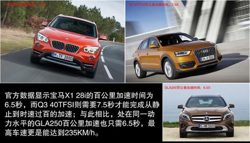 新車上市后將與奧迪Q3、寶馬X1等車型競爭,若單看性能方面,奔馳GLA具有一定優勢。官方數據顯示寶馬X1 28i的百公里加速時間為6.5秒,而Q3 40TFSI則需要7.5秒才能完成從靜止到時速過百的加速;與此相比,處在同一動力水平的GLA250百公里加速也只需6.5秒,最高車速更是能達到235KM/h,這在一定程度上彌補了GLA在車身尺寸方面的略勢。