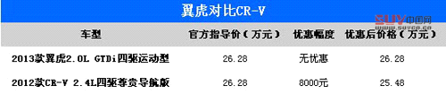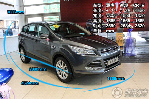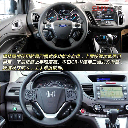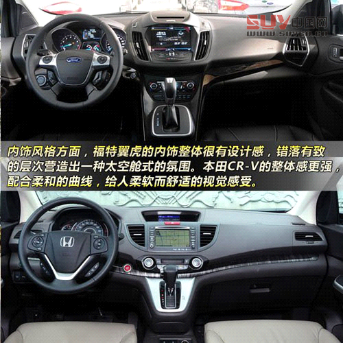 我們選擇了兩款車型中相對(duì)具有代表性的車型,福特翼虎2013款 2.0L GTDi四驅(qū)運(yùn)動(dòng)型,指導(dǎo)價(jià)26.28萬元,這是翼虎的次高配車型,頂配車型上一些非常亮眼的高科技配備在運(yùn)動(dòng)型上沒有配備,但只出現(xiàn)在頂配車型的功能,很難代表全系車型的配置水平,所以相信這個(gè)選擇大家也能接受。本田CR-V則為2012款 2.4L 四驅(qū)尊貴導(dǎo)航版,指導(dǎo)價(jià)同為26.28萬元,這是本田CR-V的頂配車型,不過該車型比次高配僅僅多帶了導(dǎo)航,在配置上可謂沒多玩把戲。在近期行情方面,CR-V全系車型都可有6000-8000元的優(yōu)惠,而福特翼虎則沒有任何優(yōu)惠。