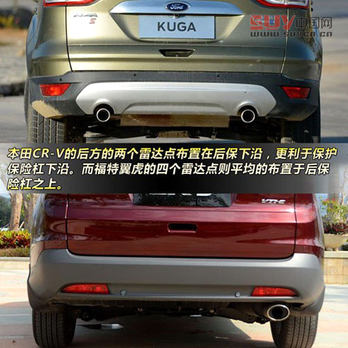 值得一提的是,兩車都配有倒車?yán)走_(dá),但CR-V的雷達(dá)布點(diǎn)顯然經(jīng)過深思熟慮,后方的兩個(gè)雷達(dá)點(diǎn)布置在后保下沿,而側(cè)向的兩個(gè)點(diǎn)布置在后保險(xiǎn)杠最邊緣的兩個(gè)角落;相比之下,福特翼虎的四個(gè)雷達(dá)點(diǎn)均勻的布置在車尾的保險(xiǎn)杠上。看起來CR-V的倒車?yán)走_(dá)對(duì)于地面上凸起的石墩或者石頭會(huì)有更高的敏感度,可以更好的避免倒車時(shí)不留神,這些障礙物傷及保險(xiǎn)杠下沿。