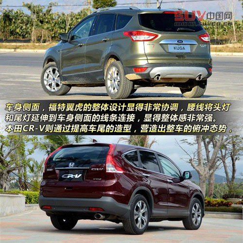 福特翼虎的外觀顯得非常動(dòng)感,延續(xù)了近年來福特車型追求動(dòng)感的設(shè)計(jì)理念,看上去就像是加高了的福克斯,而且設(shè)計(jì)細(xì)節(jié)也精打細(xì)算,可以說這個(gè)造型設(shè)計(jì)非常成功。本田CR-V現(xiàn)款車型是剛剛經(jīng)歷了換代,相較于老款車型,新車的外觀顯得更加硬朗,但它并沒有試圖顯得多有運(yùn)動(dòng)氣息或野性的感覺,它仍然堅(jiān)持城市SUV的路線,從設(shè)計(jì)語言上顯得更加外擴(kuò),使得整車顯得更寬大飽滿。