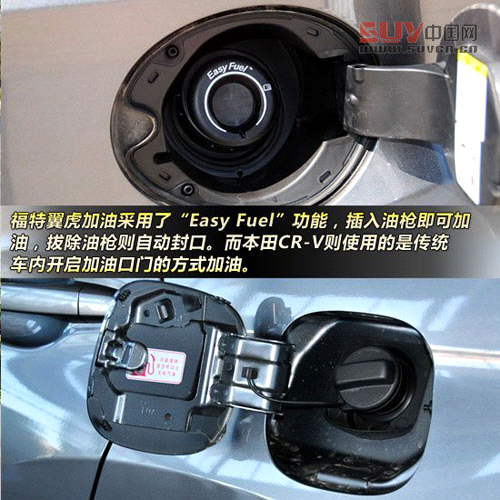 特別的是,福特翼虎加油采用了“Easy Fuel”功能,油箱蓋可以在車外直接開啟,加油的時(shí)候只需將油槍插入加油孔即可加油,結(jié)束只需拔除油槍,油箱即會(huì)自動(dòng)封口。相比之下,本田CR-V則使用的是比較常見的車內(nèi)開啟加油孔門和旋鈕式油箱蓋,方便程度不如翼虎,但勝在所有加油站的人都會(huì)熟練操作。