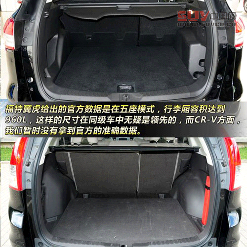 后備箱空間方面,目測(cè)福特翼虎的后備箱縱向更深,有可能導(dǎo)致后備箱容積更大。這一方面,福特翼虎給出的官方數(shù)據(jù)是在五座模式,行李廂容積達(dá)到960L,這樣的尺寸在同級(jí)車中無疑是領(lǐng)先的,而CR-V方面,我們暫時(shí)沒有拿到官方的準(zhǔn)確數(shù)據(jù)。