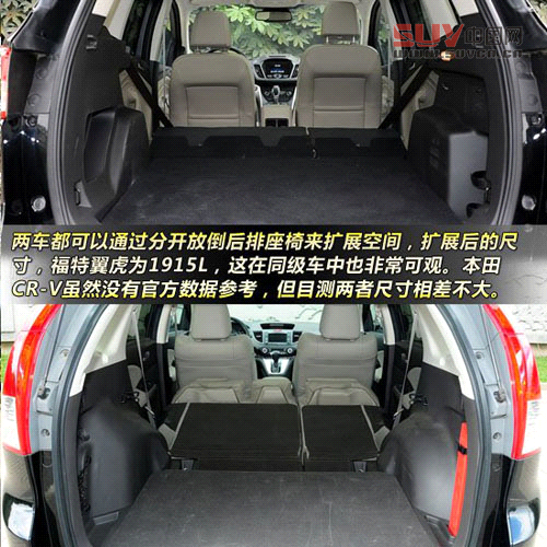 兩車都可以通過分開放倒后排座椅來擴(kuò)展空間,擴(kuò)展后的尺寸,福特翼虎為1915L,這在同級(jí)車中也是一個(gè)非常可觀的空間,這樣的容積應(yīng)付一些搬運(yùn)任務(wù)也是不在話下。本田CR-V放,同樣我們暫時(shí)沒有拿到官方數(shù)據(jù),不過目測(cè)兩車的尺寸差不多。