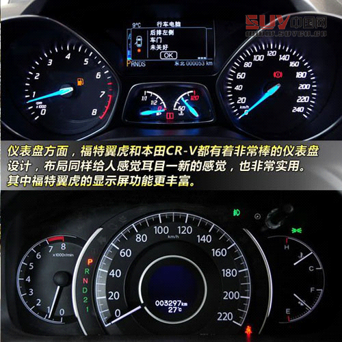 本田CR-V方面,則很特別的采用了多層次的儀表布局,由中間向外依次是行車電腦顯示屏、車速表、車輛狀況指示燈,以及左側(cè)是發(fā)動(dòng)機(jī)轉(zhuǎn)速表,右側(cè)是水溫表和燃油存量,布局非常巧妙,尤其是車款指示燈的排布方式令人耳目一新。
