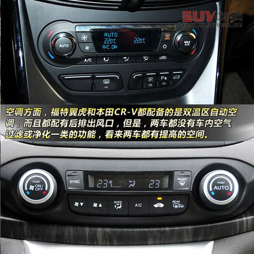 空調(diào)方面,福特翼虎和本田CR-V都配備的是雙溫區(qū)自動(dòng)空調(diào),而且都配有后排出風(fēng)口,但是,兩車都沒有車內(nèi)空氣過濾或凈化一類的功能,看來兩車都沒有跟上霧霾日益嚴(yán)重的城市的節(jié)奏。