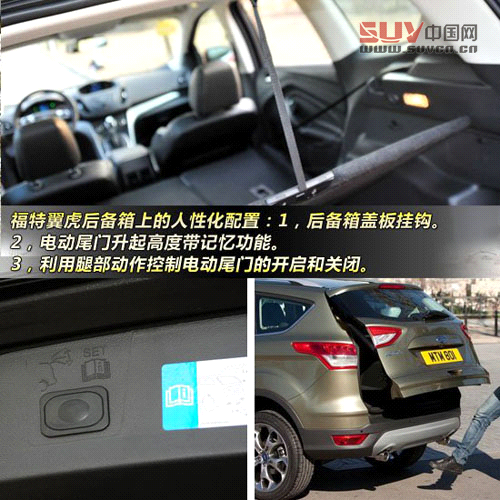 另外不得不提到福特翼虎的幾個(gè)人性化配置,第一是后備箱地板有一個(gè)掛鉤,可以懸掛于車體結(jié)實(shí)的部分,方便拿取蓋板下方的備胎等物品;第二是后備箱采用了電動(dòng)尾門,開口較大,而且開啟高度可以記憶,對(duì)于身材不高或在地下車庫使用的人來說,電動(dòng)尾門可以不開到最大角度的功能,非常實(shí)用;第三是用腿部動(dòng)作可以開啟電動(dòng)尾門,只需要將腿在后保險(xiǎn)杠下方晃一晃,尾門就會(huì)打開,對(duì)于搬運(yùn)重物的人來說非常實(shí)用。