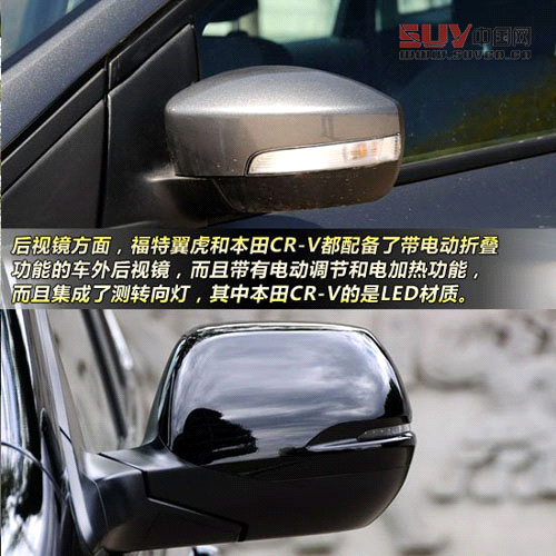 后視鏡方面,福特翼虎和本田CR-V都配備了帶電動(dòng)折疊功能的車外后視鏡,而且?guī)в须妱?dòng)調(diào)節(jié)和電加熱功能,而且集成了測(cè)轉(zhuǎn)向燈。不同的是,本田CR-V的轉(zhuǎn)向燈為LED材質(zhì),更耐用而且更小巧。反過來,福特翼虎車內(nèi)后視鏡帶有自動(dòng)防眩目功能,扳回一局。