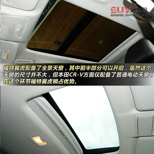 首先要說的是天窗,福特翼虎配備了全景天窗,其中前半部分可以開啟,不過平心而論這個(gè)天窗的面積并不算大,比起途觀頂配車型的天窗還顯得有些小巧。不過,本田CR-V方面則沒有配備全景天窗,而是采用普通的電動(dòng)天窗,在天窗環(huán)節(jié),福特翼虎稍占優(yōu)勢(shì)。