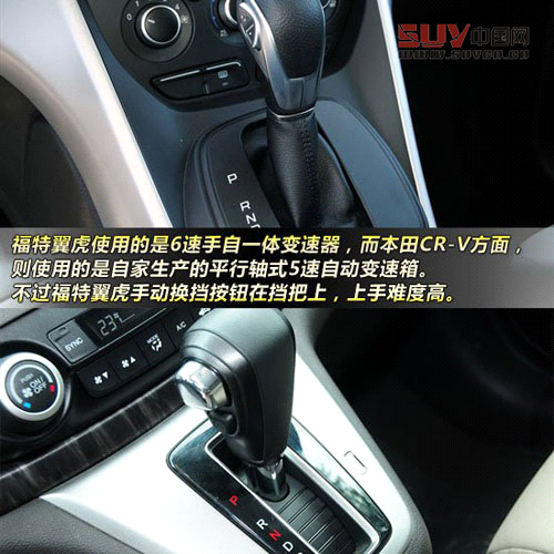 變速箱方面,福特翼虎使用的是6速手自一體變速器,而本田CR-V方面,則使用的是自家生產(chǎn)的平行軸式5速自動(dòng)變速箱,在現(xiàn)在普遍使用6速變速箱的時(shí)代,本田CR-V的5速變速箱實(shí)在不占優(yōu)勢(shì)。值得一提的是福特翼虎的擋桿設(shè)計(jì),它的手動(dòng)加減檔是通過擋把側(cè)向的按鈕完成,操作體驗(yàn)感覺并不容易上手。