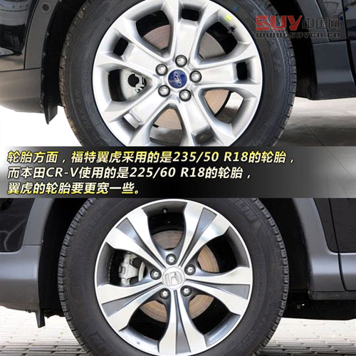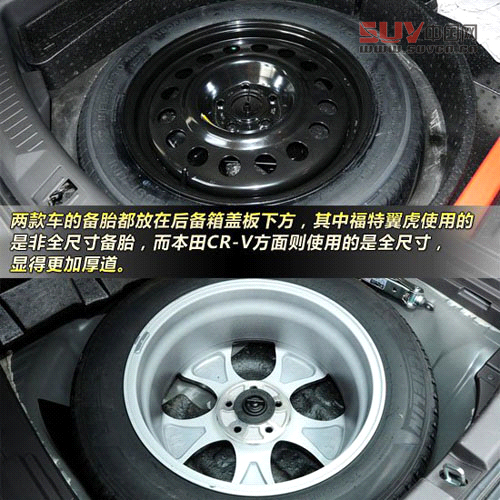 輪胎方面,福特翼虎采用的是235/50 R18的輪胎,而本田CR-V使用的是225/60 R18的輪胎,翼虎的輪胎要更寬一些,但我們共同認(rèn)為,兩輛車的車身設(shè)計(jì)配合稍大一些尺寸的輪轂會(huì)顯得更漂亮。備胎方面,兩款車的備胎都放在后備箱蓋板下方,其中福特翼虎使用的是非全尺寸備胎,而本田CR-V方面則使用的是全尺寸,顯得更加厚道。