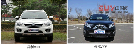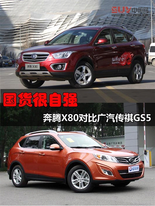 奔騰X80是奔騰旗下的第一款SUV車型,該車憑借著飽滿的外觀、豐富的配置以及之前奔騰汽車所積累的人氣,關注度一直很高,目前它在市場上的主要競爭對手有江淮S5、傳祺GS5、哈弗H6等車型。其中,傳祺GS5與奔騰X80同樣主打的是時尚外觀與豐富配置,那么今天我們就來對比一下這兩輛車,看看他們到底有什么差別。