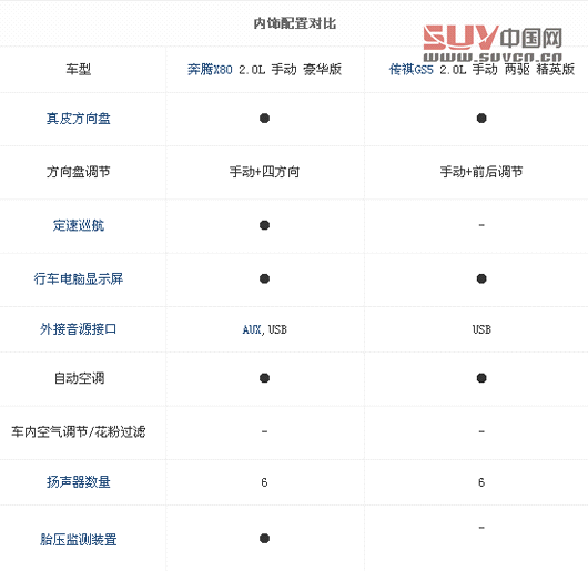 所以經過對比考慮,我們選出了價格接近、配置接近、發動機排量相同、變數箱同為手動擋的奔騰X80 2.0L手動 豪華版和傳祺GS5 2.0L 手動精英版來為您進行對比。