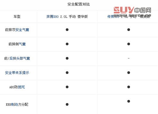 在兩車的安全配置上,奔騰X80仍然是優于傳祺GS5的,除了前排氣囊、前排側氣囊、ABS、EBD等基本配置外,多出了一項頭部氣囊的配置,從此可以看到,X80還是比較注意車輛的安全性。