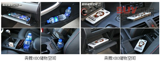 傳祺GS5的車內空間雖然不及奔騰X80,但在儲物空間方面,奔騰X80要明顯勝于傳祺GS5。奔騰X80從儀表盤到后排門護板處,整車共有20個儲物格,給整車提升了實用性;再看傳祺GS5,他的儲物空間只能用夠用來形容了。