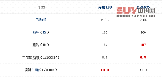 _ueditor_page_break_tag_兩車均采用了2.0L自然吸氣發動機,兩款發動機的最大功率都為103KW;在扭矩方面,傳祺GS5只是比奔騰X80多了3Nm。在兩車的實際油耗上,傳祺GS5的油耗要高于奔騰X80,原因可能是傳祺GS5的車重要大于奔騰X80、發動機的技術不成熟等原因。