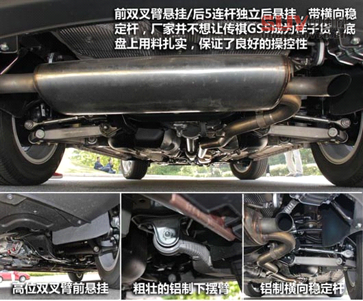 懸掛方面,X80采用了雙橫臂式前獨立懸架和后多連桿獨立后懸架的組合,在操控性和舒適性方面,表現的比較出色。傳祺GS5則采用了前雙叉臂和后5連桿底盤的組合,并帶有橫向穩定桿,整體調教更偏向運動性;此外后懸掛下擺臂和橫向桿都采用了鋁制結構,整體做工比較實在扎實。