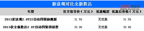 經過分析,我們選擇了兩車指導售價接近以及排量相同的車型進行比較,它們分別是途觀2013款 2.0TSI 自動四驅旗艦版,指導價格為31.58萬元;全新勝達2013款 2.0T 自動四驅頂級型,指導售價為30.98萬元。從售價來看,兩車只有6000元差價,還是比較接近的,而目前兩車都沒有什么優惠措施,所以市場行情對兩車的價格完全沒有影響。
