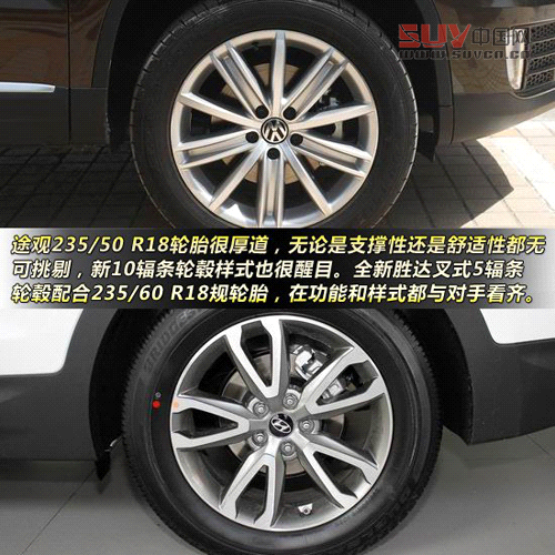 輪胎方面,途觀配備的235/50 R18很厚道,無論是支撐性還是舒適性都無可挑剔,粗細不同的新10輻條輪轂樣式無疑比老款更大氣時尚。現代品牌已經完全走在了時代前列,連輪轂細節都不放過,叉式5輻條樣式不但前衛,并且配備的235/60 R18規格輪胎在功能方面也絲毫不會輸給對手。