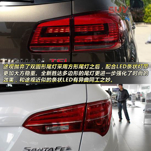 車尾方面,因為方形LED尾燈造型的加入,途觀變得更加大氣飽滿,但仍然保持了與老款極為相似的穩重感受。尾燈內的條狀LED造型不錯,看上去不但養眼同時顯示效果更明顯。黑色的后保險杠與銀色尾部護板結合,這不但擁有比較分明的越野氣質,同時也減少了對于刮擦的擔心。單邊雙出式的排氣管總體上保持了低調的風格,與全新勝達相比,途觀很顯然從頭到尾都以大氣穩重風格為主。