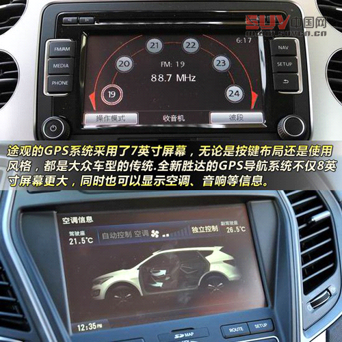 作為頂配,途觀配備了帶內置硬盤的GPS導航和中控液晶彩色屏幕,從樣式來看,途觀的這套系統采用了7英寸屏幕,無論是按鍵布局還是使用風格,都是大眾車型的傳統,不足之處就是導航的輸入方式有些不夠理想。全新勝達的GPS導航系統不僅8英寸屏幕更大,同時也可以顯示空調、音響等信息,手寫輸入也比途觀GPS方便。